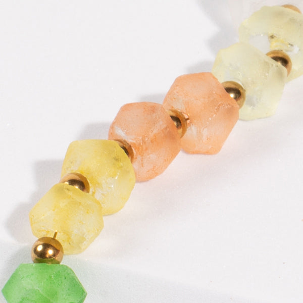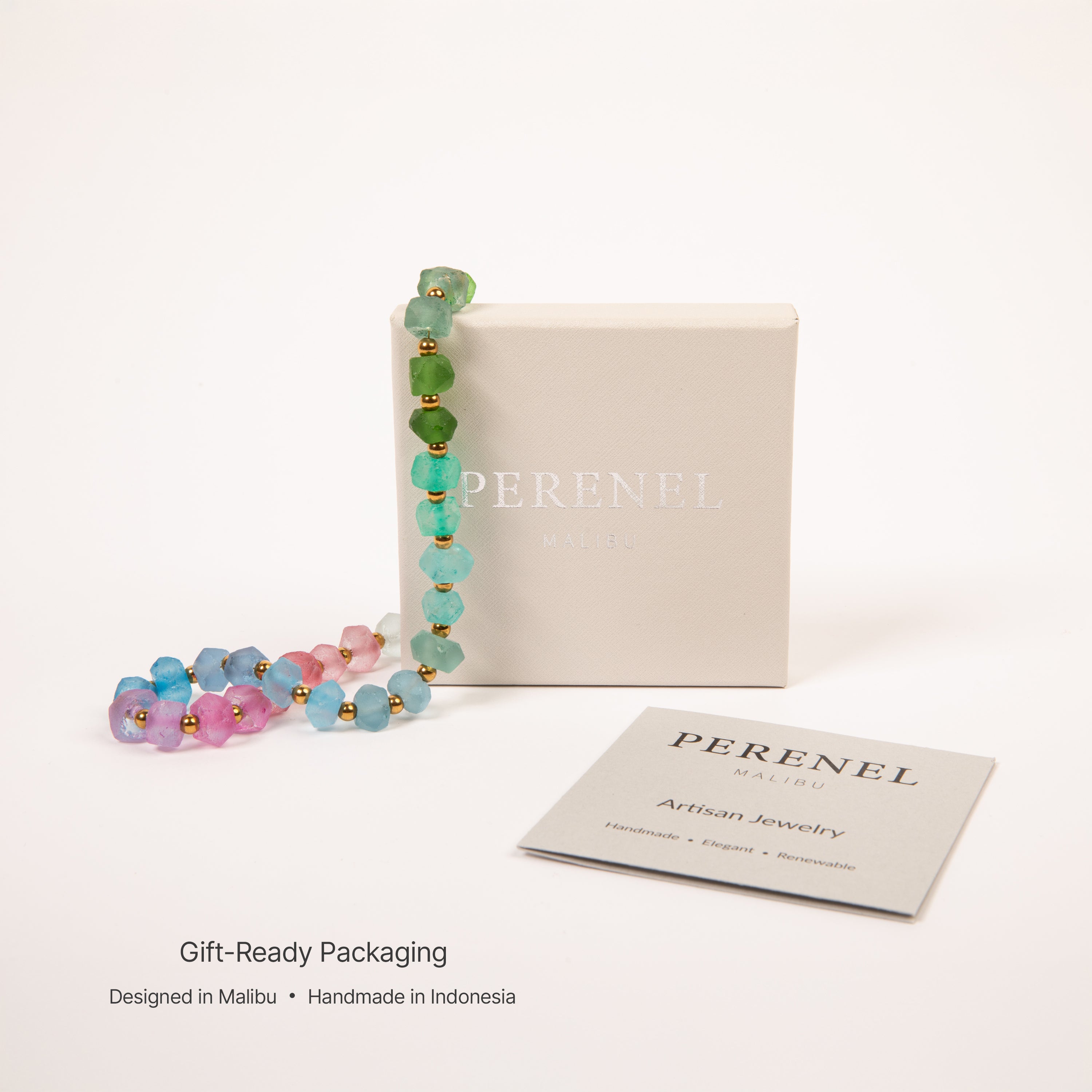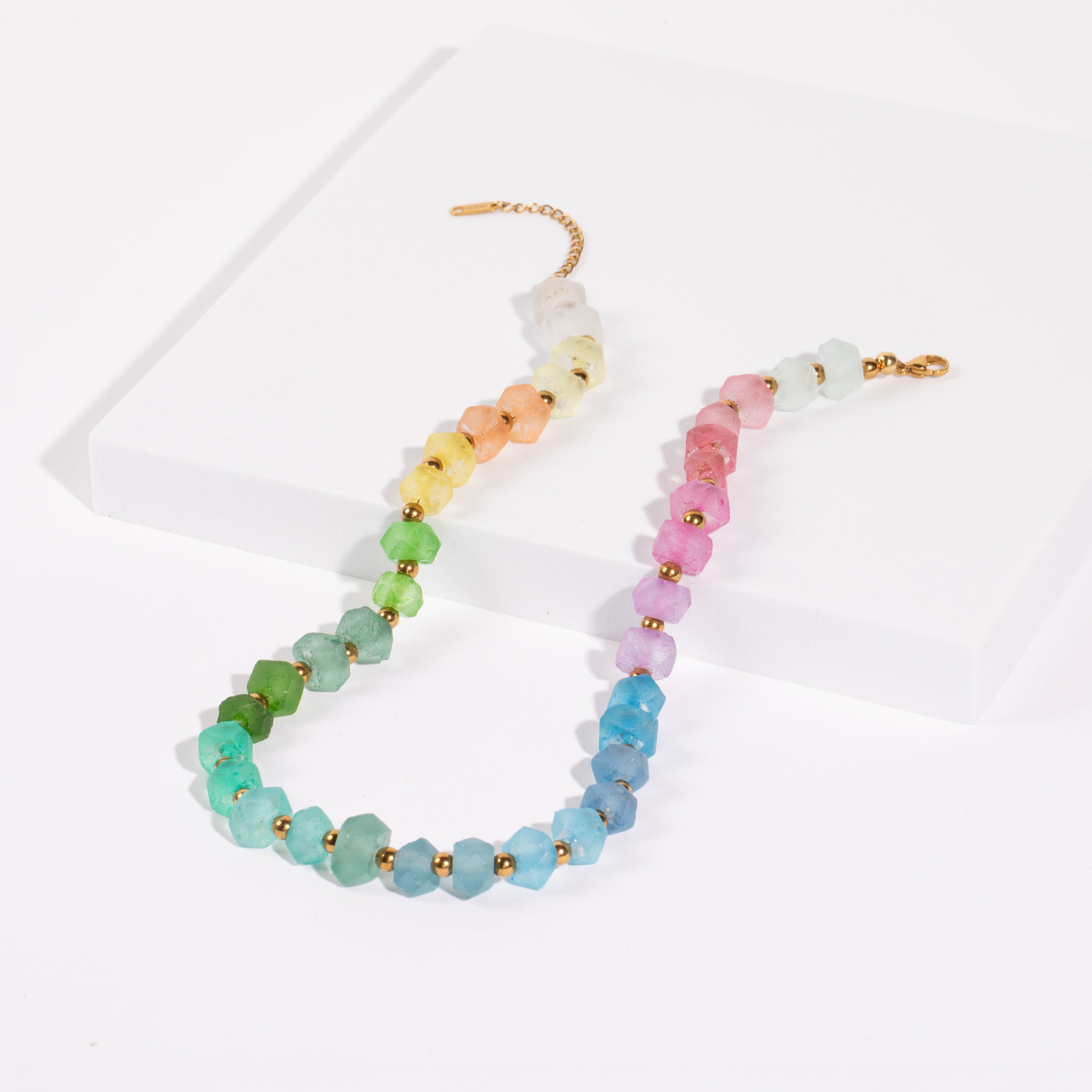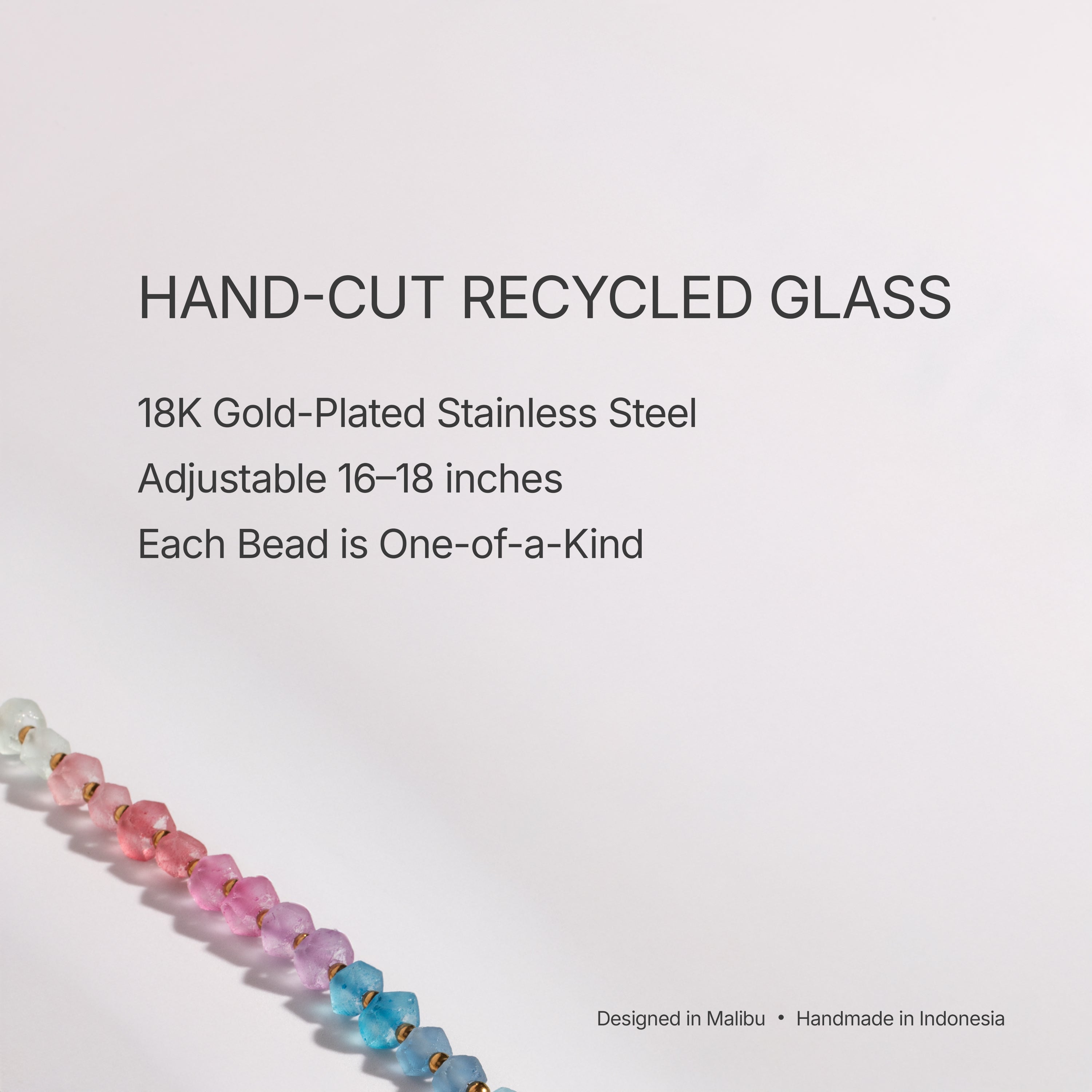 Aurora is built from more than thirty hand-cut recycled glass beads arranged in a curated color flow — not a basic rainbow, but an intentional progression where some tones linger and others shift quickly. The effect is subtle, artistic, and deeply satisfying to look at.